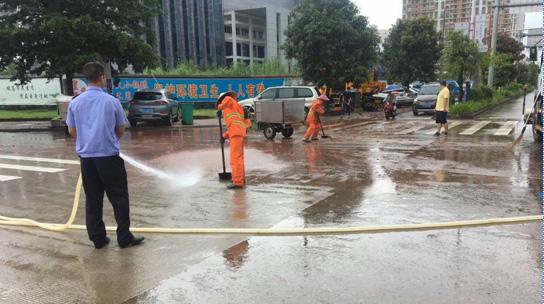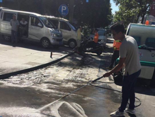 ▲對重點交易市場、政府廣場周邊清洗作業(yè)
